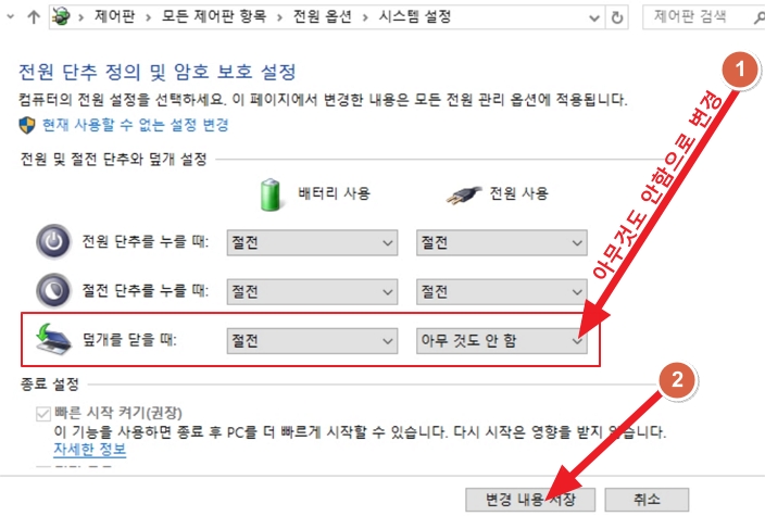 윈도우10 노트북 덮어도 안꺼지게 설정하는 방법 절전모드 해제하기