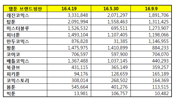 웹툰 플랫폼 브랜드평판 9월 분석 1위 레진코믹스 2위 탑툰 3위 미스터블루