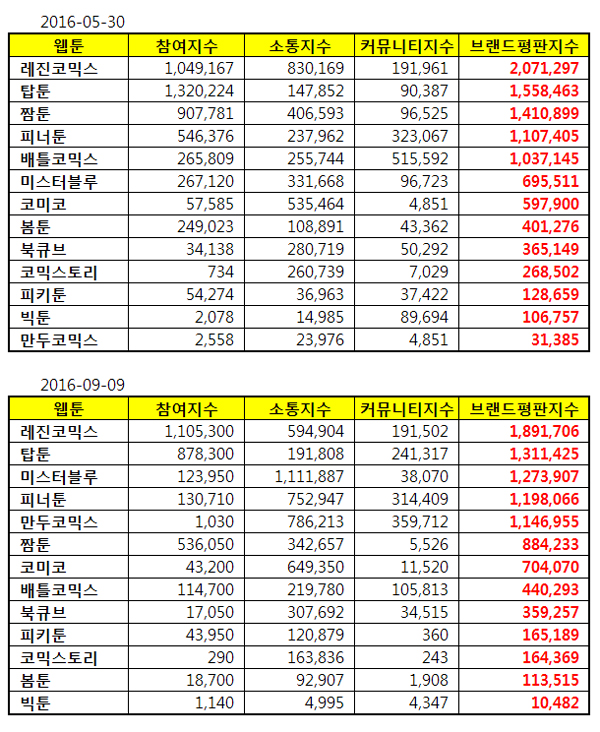 웹툰 플랫폼 브랜드평판 9월 분석 1위 레진코믹스 2위 탑툰 3위 미스터블루