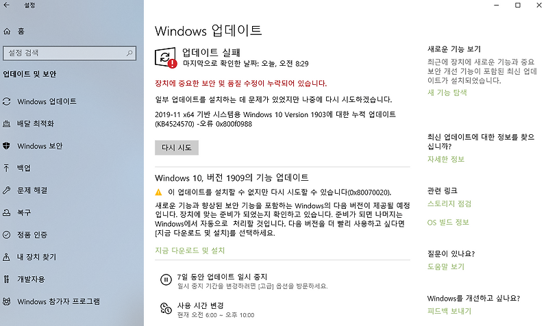 Windows 10 1903버전 업데이트 오류 질문입니다